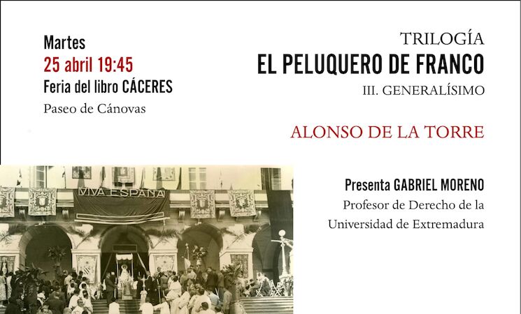 El próximo martes, 25 de abril, a las 19:45 horas, José Ramón Alonso de la Torre presentará El peluquero de Franco III. Generalísimo en Cáceres.