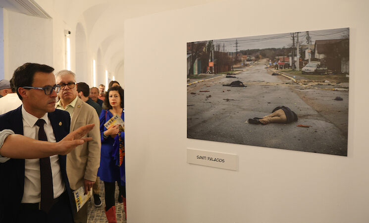 El presidente de la Diputación de Badajoz, Miguel Ángel Gallardo, ha visitado la exposición sobre la guerra de Ucrania del reportero extremeño Ángel Sastre.