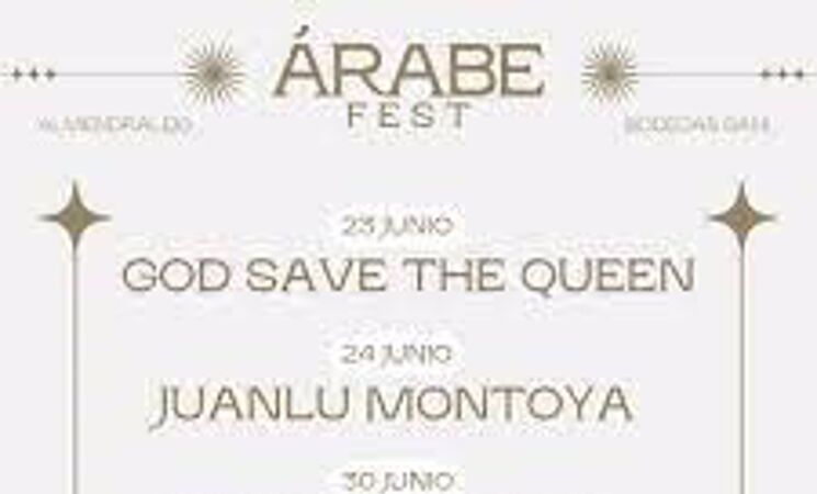 El Árabe Fest, que tendrá lugar en el interior de las Bodegas Sani de Almendralejo, comenzará el 23 de junio con el concierto de God Save the Queen y terminará el 1 de julio con la actuación de Antonio Orozco. En medio, lo harán Diego el Cigala y Juanlu Montoya.