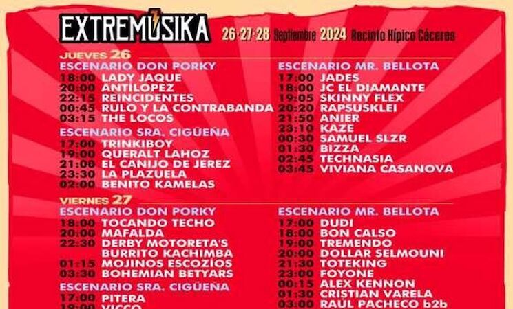 La música comenzará a sonar el jueves, día 26, a las 17,00 horas en el Escenario MR Bellota y dando protagonismo local a Jades, seguidos de JC Diamante, Skinny Flex y Rapsusklei que subirá a las 20,20 horas, para concluir con Anier.
