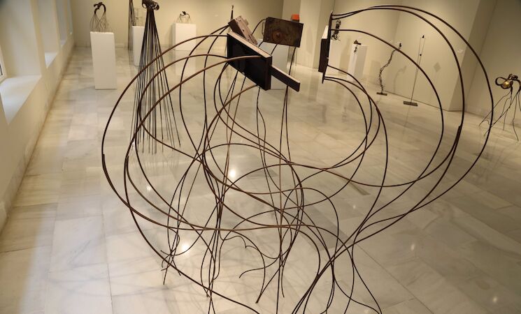 La muestra incluye esculturas de hierro, acero corten y acero inoxidable con las que el autor juega con la movilidad y la estabilidad de sus piezas, al tiempo que explora temáticas tales como el cambio climático, la despoblación o la comunicación.
