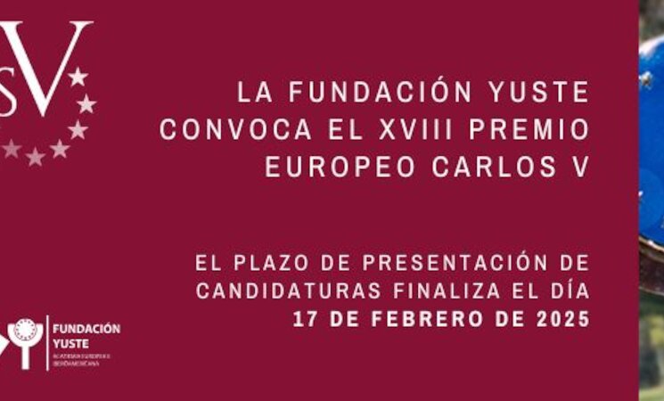 La Fundación Academia Europea e Iberoamericana de Yuste abre la XVIII convocatoria del Premio Europeo Carlos V con el fin de premiar a aquellas a personas físicas, organizaciones, proyectos o iniciativas que hayan contribuido al conocimiento general y engrandecimiento de los valores culturales, sociales, científicos e históricos de Europa, o a la unificación de la Unión Europea. Este reconocimiento cuenta con una dotación económica de 30.000 euros.