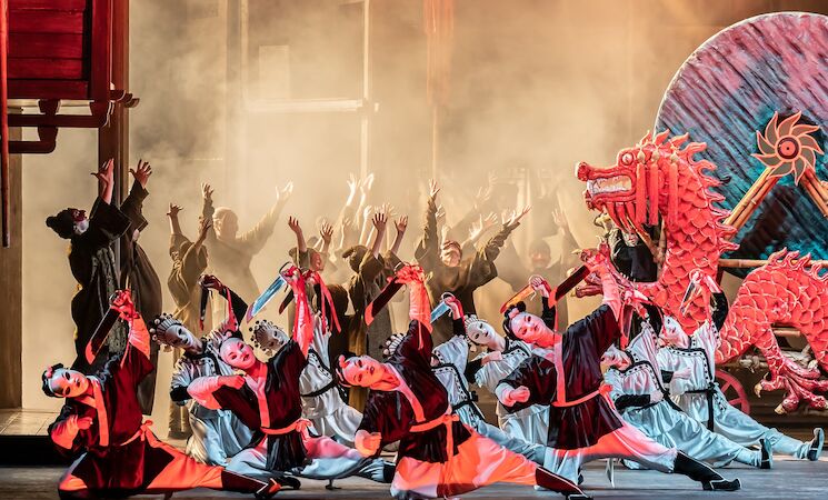 La deslumbrante producción clásica del director de ópera y teatro rumano-estadounidense Andrei ?erban se inspira en la tradición teatral china e italiana para evocar un Pekín mítico ricamente imaginado, insuflando colorido a la ópera de amor y venganza de Puccini. La puesta en escena de ?erban es una de las más espectaculares del repertorio de The Royal Opera.