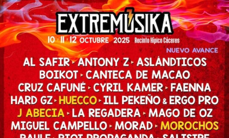 Cabe recordar que Extremúsika cuenta ya con un cartel conformado por nombres como Morad, Mago de Oz, Raule, Cruz Cafuné, Canteca de Macao, Salistre, Al SAfir, Soziedad Alkohólica, Miguel Campello, Riot Propaganda, Boikot, Aslándticos, Hard GZ, La Regadera, Ill Pekeño & Ergo Pro, Faenna, Antony Z, Tribade, además de artistas locales como Cecilia zango, Canchalera y Paranoyd Collective.