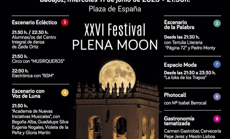 El Festival 'Plena Moon' llega este próximo miércoles, día 11, a la ciudad de Badajoz tras veintiséis ediciones nacionales e internacionales, desde 2019, con tres escenarios en la Plaza de España.