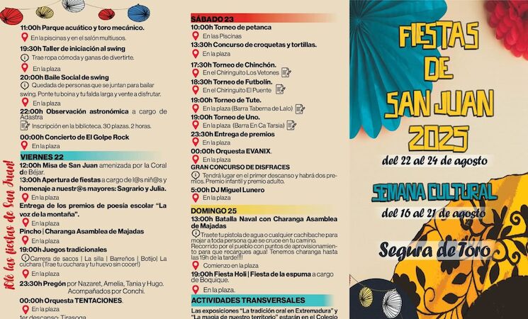 Segura de Toro celebrará su Semana Cultural del 16 al 21 de agosto y las Fiestas de San Juan del 22 al 24 de agosto, con una extensa programación que incluye actividades deportivas, culturales y musicales para todos los públicos.