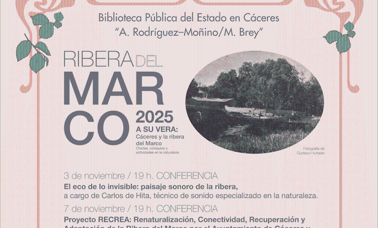 La Biblioteca Pública de Cáceres organiza, del 3 al 23 de noviembre, el V Encuentro 'A su Vera: Cáceres y la Ribera del Marco', una cita "ya consolidada" que combina charlas, coloquios, paseos y experiencias participativas en torno a la naturaleza, la historia y la identidad de la Ribera del Marco.