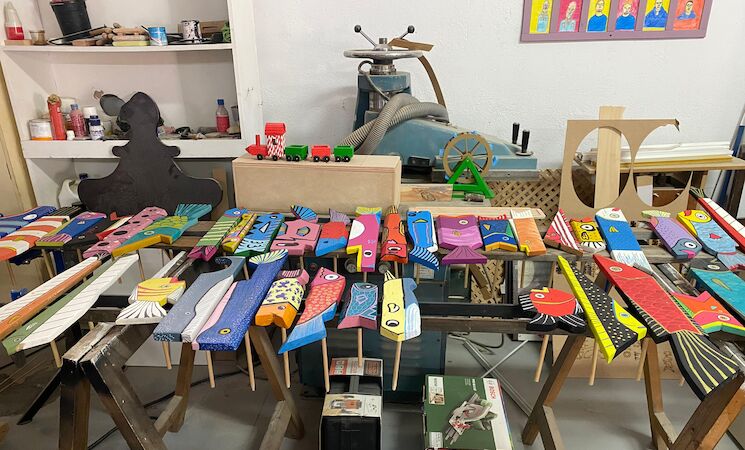 La pieza propone móviles de peces elaborados con ramas de poda y madera de palet reciclada. El gesto, sencillo y poético, apunta a la regeneración del paisaje tras los incendios del verano y subraya la apuesta de la feria por unir inclusión, mediación y sostenibilidad desde el diseño mismo del proyecto.