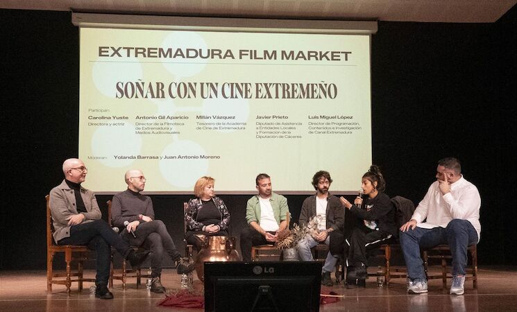 La segunda mesa de debate ha girado entorno al cine extremeño y ha contado con la presencia de la directora y actriz, Carolina Yuste, el actor y director, Alberto Amarilla, el director y productor Juan Antonio Moreno, la guionista Yolanda Barrasa, el Director de Filmoteca de Extremadura y Medios Audiovisuales, Antonio Gil Aparicio, el tesorero de la Academia de Cine de Extremadura, Millán Vázquez y el Director de Programación, Contenidos e Investigación de Canal Extremadura, Luis Miguel López.