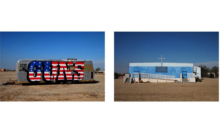 La imagen sitúa al espectador en un entorno solitario y abandonado, donde destaca el color azul sobre el paisaje desértico, transmitiendo una sensación de abandono espiritual como reflejo de una cultura.