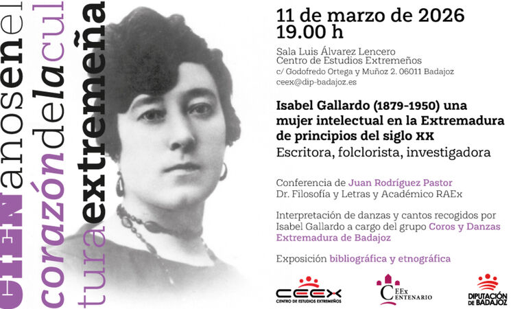 El Centro de Estudios Extremeños de la Diputación de la Badajoz organiza una conferencia, en el marco del Día Internacional de la Mujer, a la intelectual Isabel Gallardo, escritora, folclorista e investigadora del siglo XX.