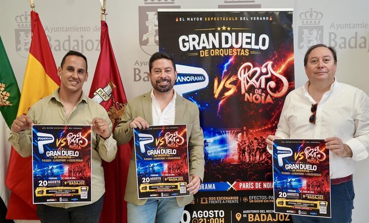El concejal de Cultura y Ferias y Fiestas, José Antonio Casablanca, acompañado por sus promotores Abraham Serradilla y Javier Pardo, y vía online por el director artístico de la Orquesta París de Noia, José Antonio Blas, y el cantante de la Orquesta Panorama, Diego Moreira, han presentado este espectáculo "único" y que esperan sea el "gran evento de este verano" en Badajoz y en toda Extremadura.