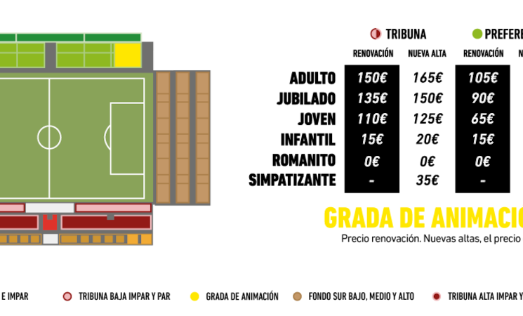 De este modo, los precios estipulados para la nueva campaña serán los siguientes: Adultos: edades comprendidas entre 21 y 64 años (1956/1999 ambos inclusive); Jubilado: personas mayores de 65 años o aquellas que acrediten jubilación anticipada mediante justificante (a partir del 1955, incluido); Joven: edades comprendidas entre 14 y 20 años (2000/2006 ambos inclusive); Infantil: edades comprendidas entre los 4 y los 13 años (2007/2016, ambos inclusive); y Abono Romanito: destinado a niños/as de entre 0 y 3 años (2017/2020, ambos inclusive). De hecho, este abono no tiene coste alguno por lo que no tiene asiento asignado.