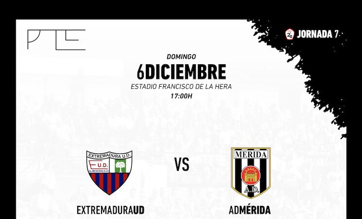 La Asociación Deportiva Mérida SAD se enfrentará este domingo, 6 de diciembre, a las 17;00 horas al Extremadura Unión Deportiva en el Estadio Francisco de la Hera en lo que será la jornada 7 del grupo V, subgrupo B, de Segunda División B.