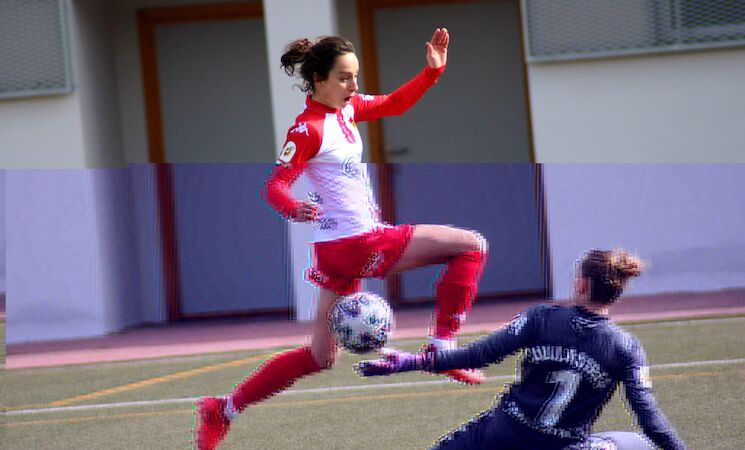 Las locales respondieron con un remate alto. En el 18' era Alba Mellado la que, tras recibir un balón largo de Estefa, controlaba y el remate, desde dentro del área se marchaba escorado.