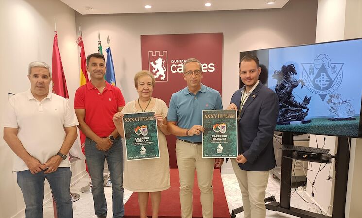 Los detalles del derbi extremeño han sido presentados este miércoles en rueda de prensa por el alcalde en funciones, Emilio Borrega; el presidente del CP Cacereño, Carlos Ordóñez, y miembros de la Asociación Fraternal San Jorge como Samuel Solís y Alonso Corrales, entre otros.