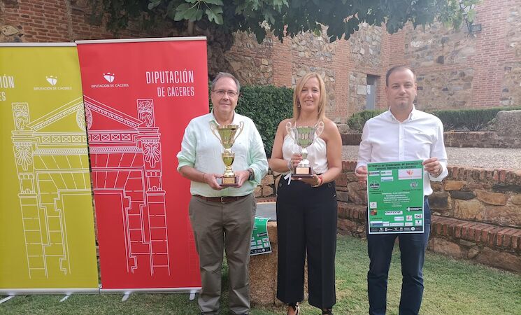 El presidente del Cáceres Ciudad del Baloncesto, José Manuel Sánchez, la diputada delegada de Turismo, Elisabeth Martín, y el diputado delegado de Deportes, Pablo Miguel López, han presentado este jueves en el Palacio de Carvajal esta cita deportiva de la provincia que cumple su novena edición.