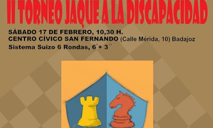 Badajoz albergará este sábado, 17 de febrero, la II edición del Torneo Jaque a la discapacidad organizado por el Club Ajedrez Ajoblanco, en colaboración con la Fundación de Jóvenes y Deporte (FJyD), dentro del Programa de Ajedrez Terapéutico Ajedrez Sin Barreras.