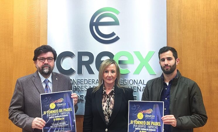 Todos los detalles de este evento han sido presentados este miércoles, en la sede de la Confederación Regional Empresarial Extremeña (Creex), a cargo del secretario general de esta última, Javier Peinado, como entidad patrocinadora; acompañado de Pilar Coslado, CEO de Almattia Eventos Empresariales a cuyo cargo está la organización del torneo, y Pablo Andreu, gerente del Club de Pádel Indoor Puente Real, que será el que acoja el evento.