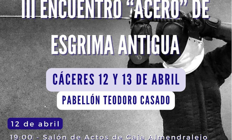 Un centenar de amantes de la esgrima y de las Artes Marciales Históricas Europeas (HEMA) procedentes de clubes y salas de armas de Madrid, San Sebastián, Salamanca, Toledo, Málaga, Granada, Sevilla y Cáceres se darán cita desde este viernes y el sábado, días 12 y 13 de abril en la capital cacereña para participar en el III Encuentro Acero.