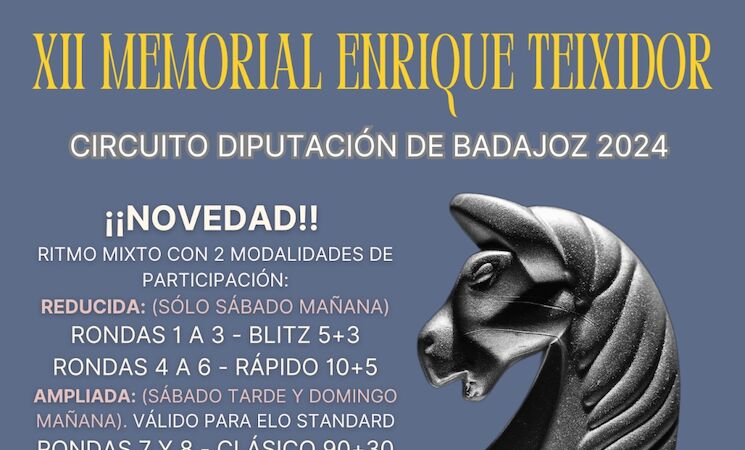 El Cibeles Club de Ajedrez de Mérida ha organizado para los días 9 y 10 de noviembre en el Lavadero de Lanas-Bodas (Avda. del Lago s/n) su torneo anual ‘Memorial Enrique Teixidor’, que alcanza este año su XII edición.
