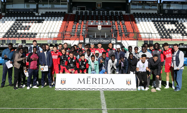 Un total de 23 jóvenes de ACCEM, organización independiente que trabaja para mejorar las condiciones de vida de personas en situación de vulnerabilidad, han visitado el Estadio Romano 'José Fouto' de Mérida, al tiempo que han conocido sus instalaciones y a los jugadores del primer equipo.