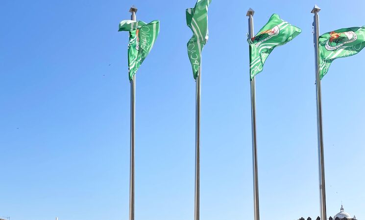 La bandera del CP Cacereño ondea desde la mañana de este jueves en la puerta del Ayuntamiento, como "muestra de apoyo" ante el partido decisivo de ascenso a Primera REF que enfrentará al equipo cacereño con el CD Estepona este sábado, 31 de mayo, a las 20:30 horas.