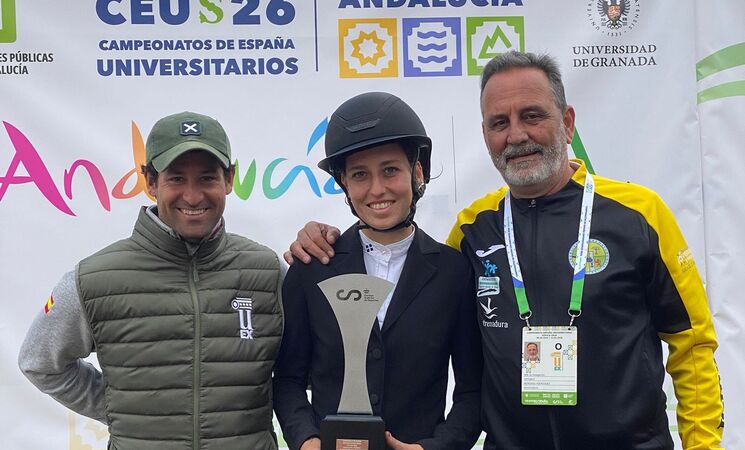 El miércoles 8 iniciaba la competición Lourdes Rodríguez Carvajal, alumna de la Facultad de Veterinaria de Cáceres, en la modalidad de Doma Clásica. Primer recorrido casi perfecto: con un solo error mínimo y un ritmo muy ajustado logró adjudicarse la primera medalla de bronce.