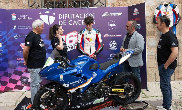 El joven piloto Rodrigo Domínguez, de 17 años y natural de la localidad serragatina de Eljas, ha presentado este martes al presidente de la Diputación de Cáceres, Miguel Ángel Morales, el equipo del que va a disponer para los próximos campeonatos de España y Portugal en los que lucirá en su moto y en su equipación el nombre de la institución provincial.