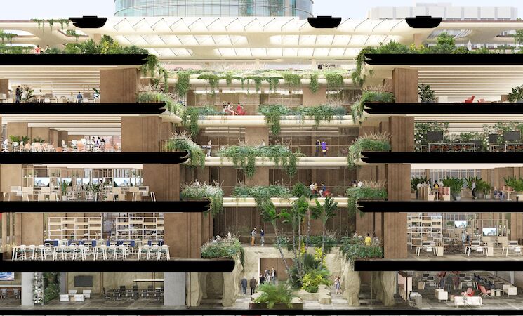 En el centro del mismo, se situará un atrio con áreas verdes, un oasis urbano en el corazón de Madrid que favorecerá la entrada de luz natural para contribuir a la salud y el bienestar de las personas y, al mismo tiempo, propiciar el ahorro de energía.