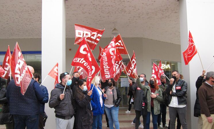 En la protesta, celebrada frente a la sucursal del BBVA por ser una de las grandes empresas cliente de Contact Center y con la que CCOO y UGT en la región se suman a la movilización nacional organizada por los sindicatos exigiendo el desbloqueo de dicho convenio sectorial, se han escuchado gritos como 'Por un salario justo' o 'Por un convenio digno' y ha contado con la presencia de la secretaria general de CCOO en Extremadura, Encarna Chacón.
