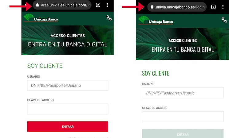 Estos mensajes contienen un enlace y, al clicar en él, se abre un formulario que es esencialmente idéntico al real de estas entidades bancarias, en el que "la única diferencia apreciable es la dirección de la web (señalada con una flecha), pero aún eso es muy similar, pues el estafador ha configurado una dirección con expresiones prácticamente idénticas a la real".