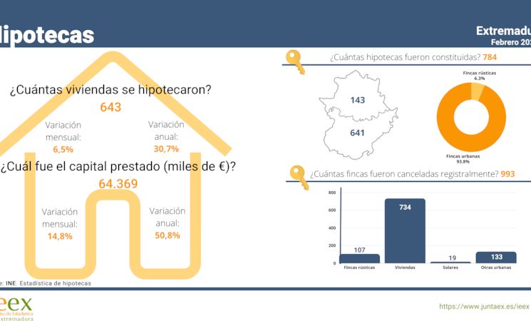 Igualmente, en el caso de las viviendas, el número de hipotecas que modifican sus condiciones es de 129 (un 17,27% más que febrero de 2023), según informa el Instituto de Estadística de Extremadura (IEEX) en una nota de prensa.