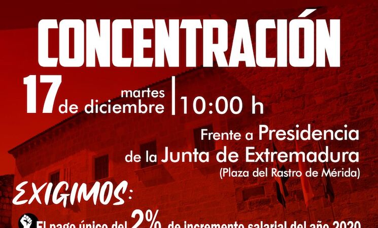 El sindicato CCOO se concentrará este martes, 17 de diciembre, frente a Presidencia de la Junta de Extremadura, en Mérida, para reclamar el abono "en único pago", del 2 por ciento de incremento salarial, que la Junta de Extremadura adeuda a los empleados públicos desde 2020.