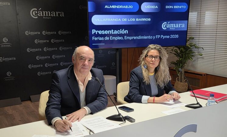 El presidente de la Cámara de Comercio, Mariano García, acompañado de la directora, Sandra Soriano, ha presentado esta iniciativa territorial de activación del talento en Extremadura que prevé la participación de entre 2.500 y 3.000 personas, más de 400 empresas, más de 200 entidades colaboradoras, 150 ofertas de empleo y más de 300 entrevistas laborales reales.
