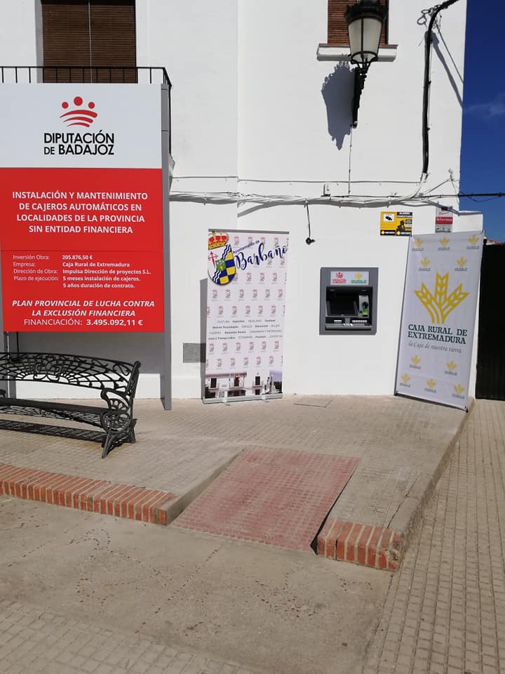 En la comarca de Tierra de Mérida-Vegas Bajas se encuentra el municipio de Barbaño, donde se instaló el cajero automático el 22 de mayo de 2019 para dar servicio a los 655 habitantes que tiene hoy en día empadronados. Instalado justamente en el edificio del Ayuntamiento, cuya fachada está en la Plaza de España, a éste se accede por un lateral de la Casa Consistorial, concretamente por la calle La Virgen.