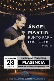 Al Palacio de Congresos de la capital del Jerte llegará el día 23 de noviembre, a las 21:00 horas, Ángel Martín con su nuevo espectáculo ‘Punto para los locos’, con el que intentará que el público se dé cuenta de que “lo único que nos diferencia no es si estás o no estás loco, sino a qué volumen están en tu cabeza la voz de la vergüenza, el miedo, los agobios o la impaciencia”. Para más información y venta de entradas, los interesados sólo tienen que adentrarse en la web del Palacio de Congresos: https://www.palcongrex.es/plasencia/agenda/angel-martin-punto-para-los-locos