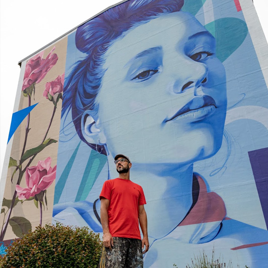 Para JATO 2024, el artista realizará una instalación mural en la que aparecerá el busto de una chica vestida de folklore extremeño, con un pañuelo bordado sobre los hombros.