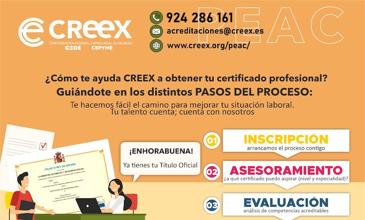 CREEX te lo pone fácil. Basta contactar con nosotros a través del formulario que encontrarás en https://creeex.org/peac/ (si pones en Google CREEX PEAC te saldrá como primer resultado) y dejar unos pocos datos de contacto. O bien llámanos al 924286161 o escríbenos a acreditaciones@creex.es