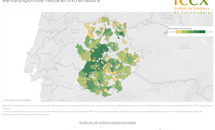La ciudad de Badajoz y la localidad cacereña de Almaraz son los dos municipios con la renta media disponible más alta de la región en 2018, mientras que las localidades pacenses de Zahínos y Puebla de Obando, cuenta con la renta más baja.