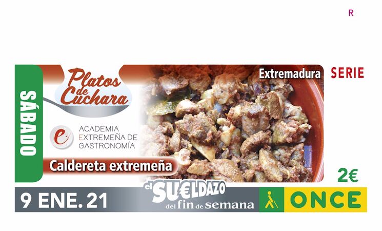 Cinco millones de cupones llevarán por toda España la caldereta extremeña, protagonista del cupón de la ONCE del sábado 9 de enero dentro de la serie 'Platos de cuchara'.