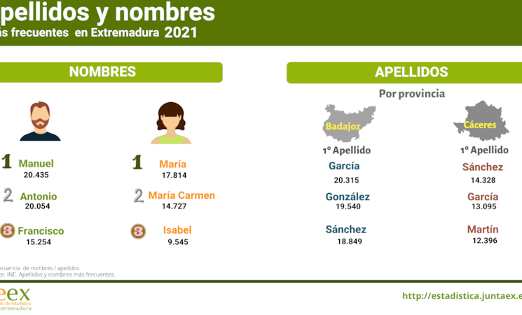 De igual modo, los primeros apellidos más frecuentes entre los residentes en Extremadura en 2021 han sido García, González y Sánchez en la provincia de Badajoz; y Sánchez, García y Martín en Cáceres.