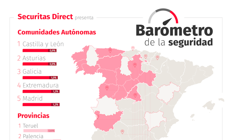 Castilla y León, Asturias, Galicia, Extremadura y Madrid son las comunidades autónomas más seguras de España, es decir, con el menor volumen de intrusiones a viviendas y negocios.