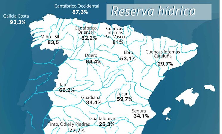 Sin embargo, permanecen por debajo de la mitad de su capacidad total las cuencas del Guadiana, que está al 34,4 por ciento; Guadalete-Barbate, al 30,3 por ciento; Guadalquivir, al 25,3 por ciento; la cuenca Mediterránea Andaluza al 37,7 por ciento; Segura, al 34,1 por ciento y las cuencas internas de Cataluña, al 29,7 por ciento.
