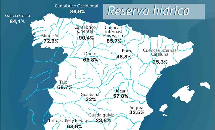 Sin embargo, están por debajo de la mitad de su capacidad las cuencas del Guadiana, que está al 32 por ciento; Guadalete-Barbate, que está al 25,8 por ciento; Guadalquivir, al 23,8 por ciento; la cuenca Mediterránea Andaluza, al 34 por ciento; Segura, al 33,5 por ciento; Ebro, al 48,8 por ciento y las cuencas internas de Cataluña, al 25,3 por ciento.