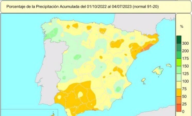 Las precipitaciones recogidas en el conjunto de España desde que el pasado 1 de octubre comenzó el año hidrológico, hasta el 4 de julio han alcanzado los 476 litros por metro cuadrado, lo que representa un 14 por ciento menos de lo normal, que serían 556 litros por metro cuadrado, según ha informado la Agencia Estatal de Meteorología (AEMET), cuyas cifras reflejan que en la última semana el déficit hídrico se ha reducido en un punto porcentual.