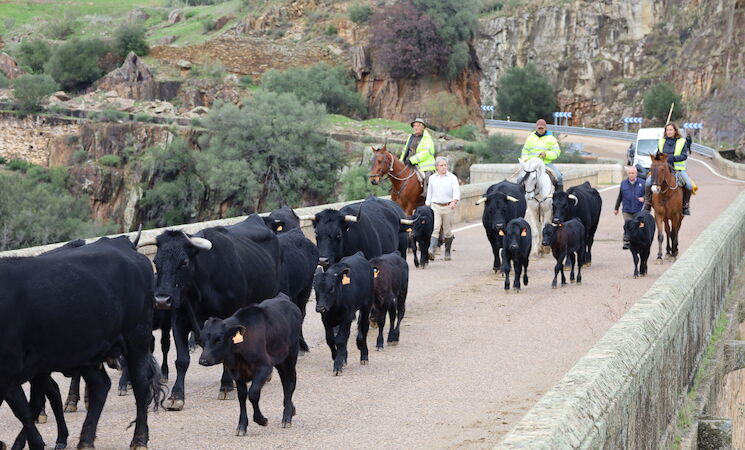 En este tramo por la provincia cacereña, de gran belleza paisajística, las reses han cruzado el río Tajo por el viejo puente de la carretera Nacional V con los encinares de la zona como decorado natural de fondo.