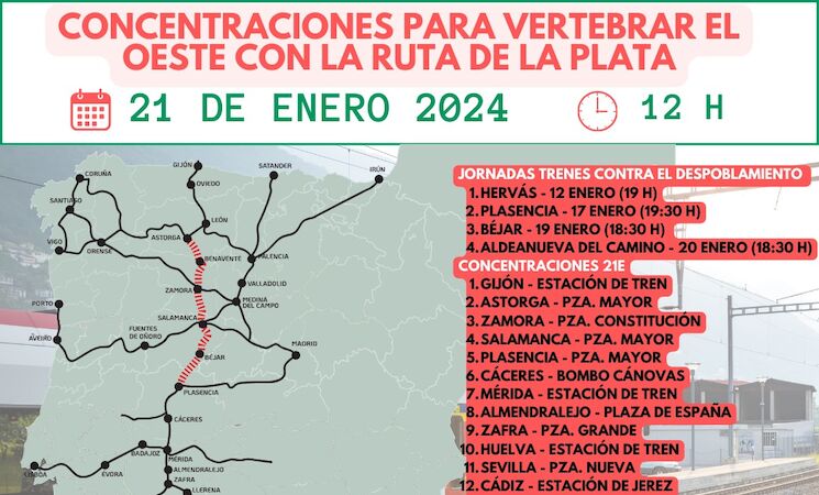 Las organizaciones que han convocado para el próximo domingo, 21 de enero, una serie de concentraciones en 11 localidades del Oeste Ibérico en pro de la recuperación del tren Ruta de la Plata, han emitido un manifiesto.