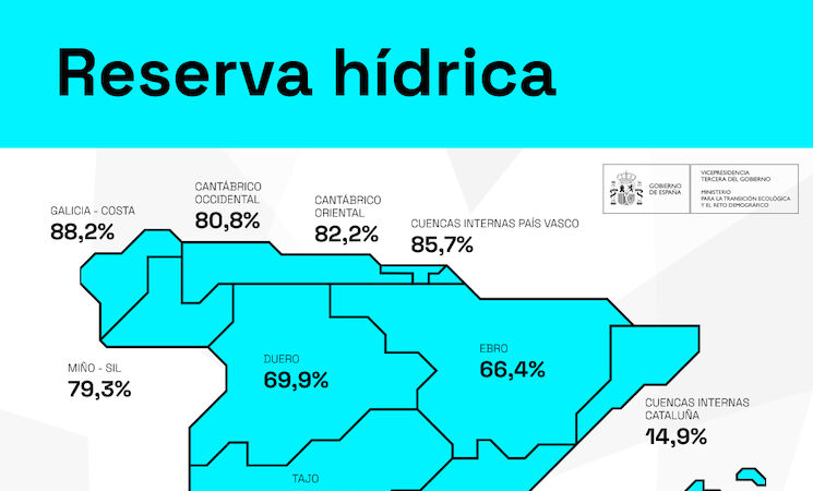 Así pues, la reserva hídrica española está al 52,9% de su capacidad total. Los embalses almacenan actualmente 29.665 hectómetros cúbicos (hm3) de agua, aumentando en la última semana en 483 hectómetros cúbicos (el 0,9% de la capacidad total actual de los embalses). Las precipitaciones han afectado considerablemente a toda la península y la máxima se ha producido en Vigo con 141 l/m2.