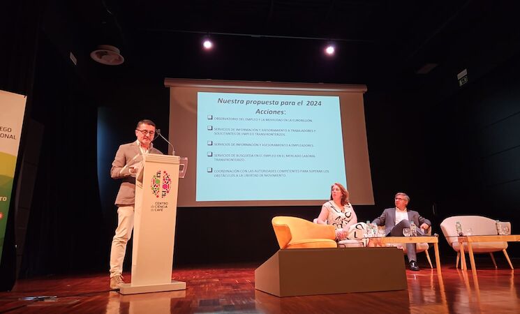 El director general de Empleo, Pedro Galán, ha participado en la jornada Proyecto EURES Transfronterizo Extremadura / Alentejo 2024-2026, en el Centro de Ciência do Café en Campo Maior donde ha subrayado el impulso de la Junta de Extremadura al nuevo proyecto EURES, que se ha ampliado en dos años más y ha dado comienzo este pasado 1 de junio, duplicándose el presupuesto.